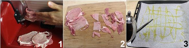 To prepare gyros, start by finely slicing the meat, using a slicer because it needs to be very thin 1, and cut the slices into smaller pieces 2. Line a baking tray with parchment paper, oil it 3