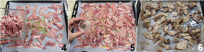 and place the pieces of meat on top 4. Season them with a sprinkle of black pepper 5 and bake them in a preheated oven at 350°F for 30 minutes 6: the meat should be well-cooked and crispy.