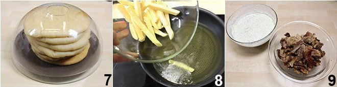 Prepare the pitas following the procedure you find here (Pita) and once baked, keep them under a glass dome until ready to use 7. Fry the fries 8 and keep them warm, then transfer the meat to a bowl and get the tzatziki 9, which you’ve already prepared following the instructions found Tzatziki (Tzatziki).