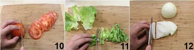 Cut all the vegetables that will be used to fill the gyros: wash the tomatoes and slice them 10, wash the lettuce and cut it into smaller pieces 11, and finely slice the white onion 12.