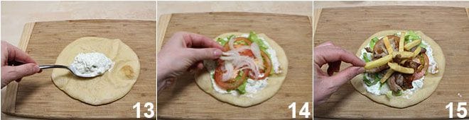 At this point, you can assemble your gyros: on each pita, spread a tablespoon of tzatziki 13, fill with some lettuce, tomato slices, and a few onion strands 14. Add the meat and a few fries 15 to complete. Close the gyros starting from the bottom, heat it for a few minutes in the oven, and serve it hot!