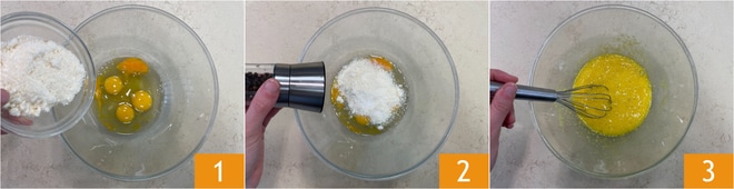 To prepare the ham and cheese omelette, first crack the eggs into a bowl, add the parmesan 1, salt, pepper 2, and beat until you get a homogeneous mixture 3.