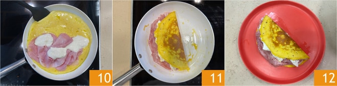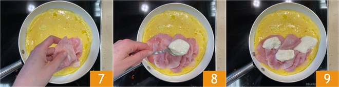 At the end of cooking, add the cooked ham 7 and stracchino 8 9 on one half of the omelette.