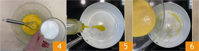 Gradually add the milk 4 while continuing to stir, in the end, you should obtain a fairly liquid homogeneous mixture. Put a drizzle of oil in a non-stick pan 5, then pour the mixture 6 and cook for about 10 minutes over medium heat.