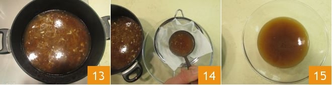 After the necessary time 13, place a thin-mesh food paper over a colander. Alternatively, you can use food-grade gauze. Using a ladle, extract only the liquid part, reserving the ham and shallot for later use, and pour it into the colander 14 to filter it. As soon as you have obtained all the broth 15, store it in the refrigerator for the next 24 hours, and in the meantime, prepare the ham powder.