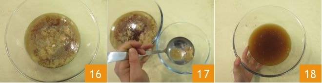 After 24 hours, take out the broth. You will notice that the dark liquid part has remained at the bottom, while the fat has surfaced 16. Using a ladle, remove the fat part 17 until you obtain a clear, completely defatted broth 18.