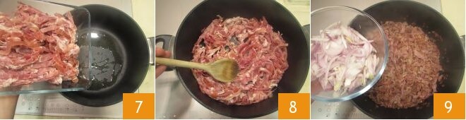 When the oil is very hot, add the ham 7 and let it brown, stirring often 8, until it tastes very crispy. This phase is very important because it extracts the flavor of the ham and the saltiness, so you won’t need to add salt to the broth. When the ham is well-roasted, add the shallots 9