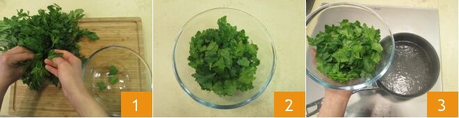Pick only the parsley leaves until you get 5.3 oz (1-2). Meanwhile, place a pot full of lightly salted water on the heat, and as soon as it starts boiling, immerse the parsley 3.