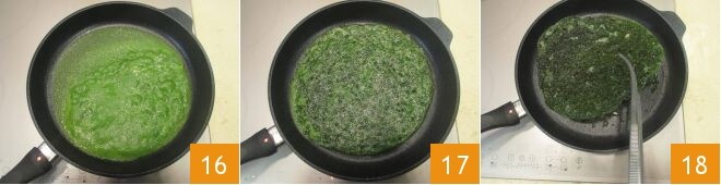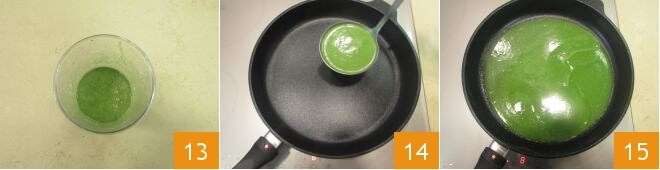 for about 5-6 minutes until you get a smooth and velvety cream 13. At this point, heat a pan about 11 inches on the stove and pour a ladle of the mixture (14-15).