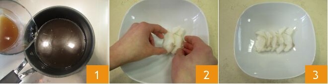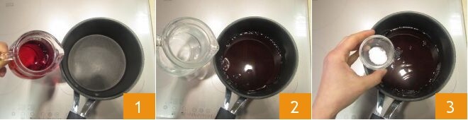 Now, take care of the radish cooking. First, pour the vinegar 1, water 2, and salt 3 into a rather small pot. Bring to a boil.