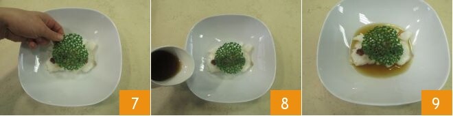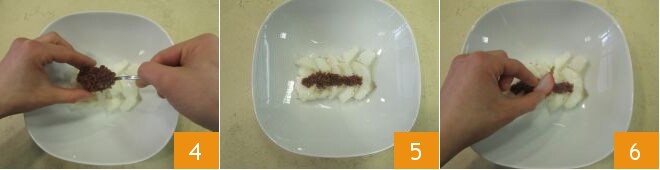 Then powder with the ham powder, making a line in the center (4-5). Also, place 1/4 of the radish in the center 6