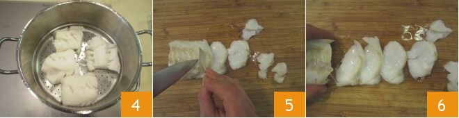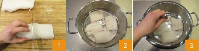 When everything is ready, take care of the cod. Divide the cod fillets into 4 pieces 1. Then take a steamer, place hot water underneath, and a pinch of salt. Place the basket on top and position the 4 cod fillets 2. Cover with the lid 3