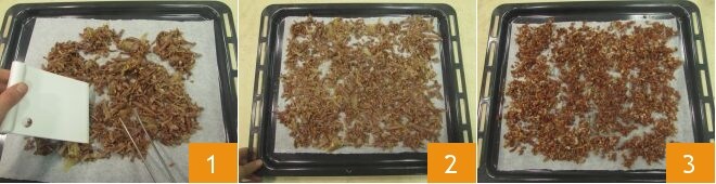 While the broth completely cools in the refrigerator, prepare the ham powder. Take what you set aside with the shallot and transfer it to a baking sheet lined with parchment paper. Then, using a ladle and a scraper, spread it out (1-2) so that it covers the entire tray without overlapping the pieces 2. This phase is very important because the more evenly the ham is distributed, the more it will dry uniformly. Bake in a preheated static oven at 158°F on the central shelf. After 24 hours, remove the tray from the oven 3. You will immediately notice that the ham and shallot are well-dried.