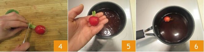 Meanwhile, rinse the radish and cut off the green part of the leaves 4. As soon as the liquid reaches a boil, place the radish in the cooking water 5 so that it is completely covered, and let it cook for 20 minutes. After this time 6, let it cool in the cooking water for another 20 minutes.