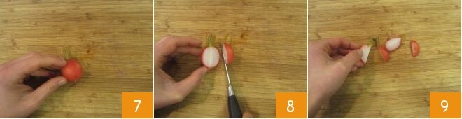 and the wafer above the radish 7. Finish by pouring the ham broth 8 and serve immediately 9.
