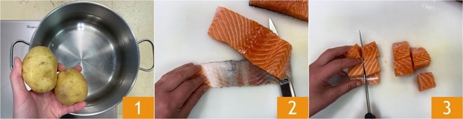 To make the salmon burger, first boil 2 small potatoes for about 30 minutes or until they are soft 1; you can check the consistency by piercing the flesh with a fork. Meanwhile, remove the skin from the salmon 2 and extract any bones, then cut it into chunks about 3/4 inch in size 3.