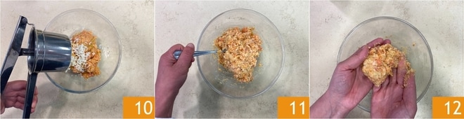 Meanwhile, the potatoes will be cooked, place them in the potato ricer and collect the puree in the bowl with the salmon mixture 10. Mix well to combine everything 11. Now form the burgers: with slightly dampened hands, take 1/4 of the mixture 12.