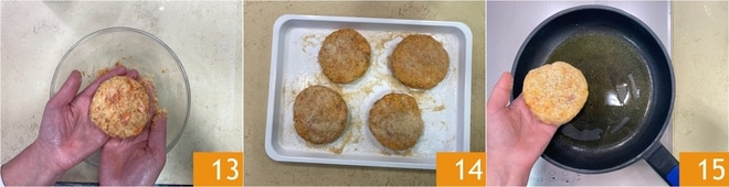 Form a ball and then flatten it to get the typical disc shape 13. As you form the burgers, place them on a tray 14. Proceed to cooking: heat a splash of oil in a non-stick pan and add the burgers 15.