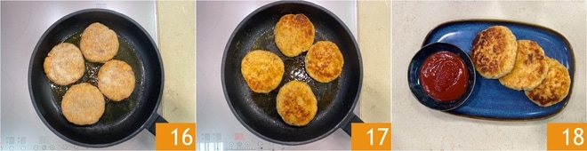 Cook until golden 16, then flip them and continue cooking on the other side 17, it will take about 2-3 minutes per side. Once ready, serve your salmon burgers hot, accompanied by your favorite sauces 18!