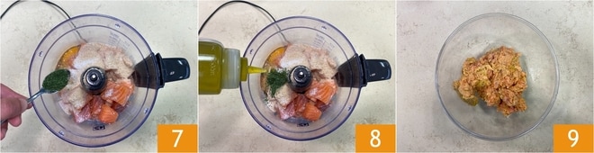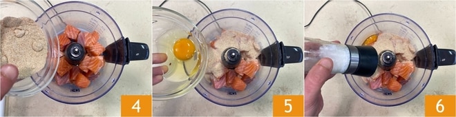 Transfer the salmon cubes to the mixer, then also add the breadcrumbs, the egg 5, salt, and pepper 6.