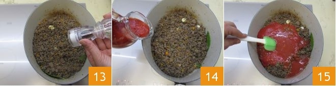 Also adjust the pepper 13, then pour in the tomato purée 14 and water. Make sure to mix the other ingredients well 15.