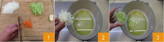 To prepare the hare ragù, start with the sauté, washing and drying the vegetables and aromatic herbs. Peel the carrot and trim it, remove the outer strings of the celery, and clean the garlic and onion. Then finely chop the celery, carrots, and onion 1. Next, take a pot with a non-stick and thick bottom, pour in the oil and heat it slightly, then add the chopped onion 2 and celery 2,