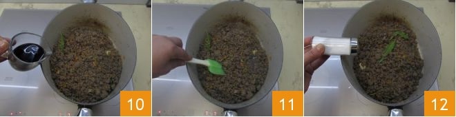 Deglaze with red wine 10 and let it cook over high heat for 5-6 minutes, until the wine has evaporated, stirring occasionally 11. Then, adjust the salt 12.