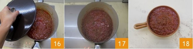 At this point, cover the ragù with the lid 16 and let it cook over very low heat for about 4 hours, stirring rarely: just a few times to check that it does not stick to the bottom. At the end of cooking, the ragù should be rather dense and full-bodied 17; as a last step, remove the garlic. Your hare ragù will be ready to be used in your dishes 18!
