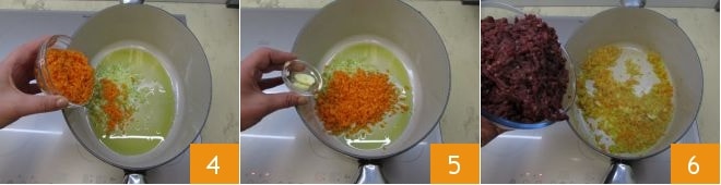 also add the carrot 3 and the peeled garlic from which you have removed the core 4. You can add it cut in half so that it is easier to remove later. Sauté the ingredients over very low heat for about 6-7 minutes, stirring occasionally. When the sauté is ready, also add the hare meat 6.