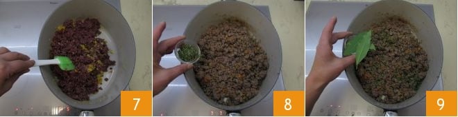 Stir and let the meat absorb the flavors, browning it for 4-5 minutes over low heat 7. Then, season with finely chopped rosemary sprigs 8 and bay leaves 9.
