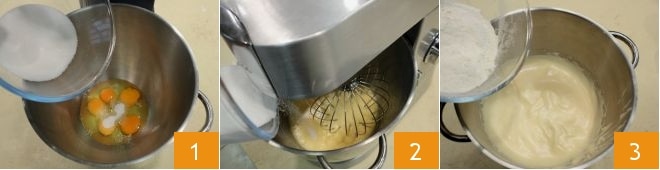 To prepare the hazelnut cream roll, start by making the sponge cake: in the bowl of a stand mixer, pour the eggs and part of the sugar 1: you will need to add the sugar in three batches, gradually as you run the stand mixer 2. Once finished, stop the mixer and pour in the sifted flour 3, then mix with a soft spatula.