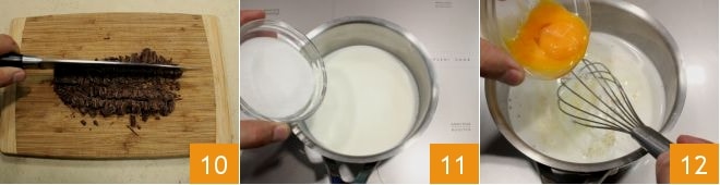 Finely chop the dark chocolate 10, then pour the milk into a saucepan together with the sugar 11. Heat and as soon as it reaches a boil, remove it from the heat, add the yolks while stirring with a whisk to break them 12. Place back on heat for a few minutes and as soon as it returns to a boil, turn off