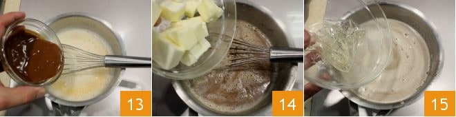then add the hazelnut cream 13 and the butter in pieces 14. Let it cool for a few minutes, then add the previously soaked and well-drained gelatin sheets 15; melt them completely while always stirring with the whisk.