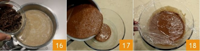 Immediately after, add the previously chopped chocolate 16 and melt it completely while stirring. Pour the obtained mixture into a bowl 17 and cover with cling film in contact 18. Let it cool at room temperature for at least 30 minutes, then an hour in the refrigerator.