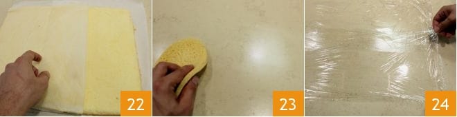 When the sponge cake is cool, remove the towel and the parchment paper layer 22, then pass a damp cloth over the work surface 23 and then lay out two sheets of cling film, which are 2 inches longer than the dimensions of the sponge cake, slightly overlapping 24.