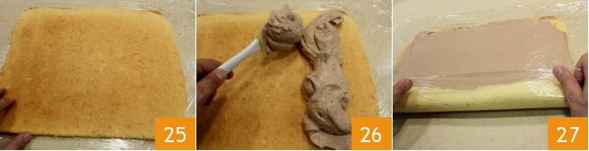flip the sponge cake onto the cling film and remove the other sheet of parchment paper: the dark side of the sponge cake should face up 25; fill the sponge cake with a layer of hazelnut cream 1/2 inch thick, leaving about 1/2 inch from the edge 26. When you have finished, roll the sponge cake with the help of the cling film, starting from the longer side in front of you 27. As you roll, remember to remove the excess film from the edges.