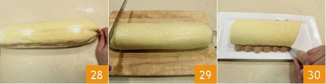 After rolling, twist the excess film on the edges 28 and while holding the ends tightly, pull with your hands outward and simultaneously move the roll away from you, allowing it to "walk" on the work surface, to tighten it like a candy. If bubbles form, pierce the film with a knife 29: put in the refrigerator to firm up for at least 40 minutes. Once cooled, cut the two ends with a smooth blade knife and place the roll on a serving plate. Then pour any leftover hazelnut cream into a piping bag and decorate the roll around the longer sides with small dollops 30.
