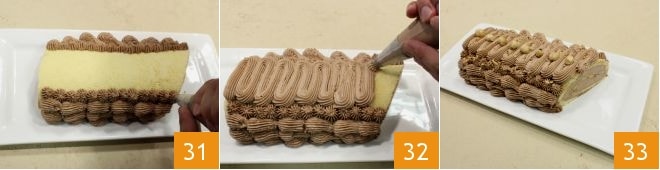 then on the sides and finally with other cream decorations on the surface (31-32); your hazelnut cream roll is ready to be enjoyed 33! You can decorate it to your liking with whole or chopped hazelnuts or chocolate chips!