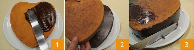 Now that you have all the preparations ready, begin assembling the heart cake: take one of the two bases and place it on a serving plate: create a layer of chocolate ganache covering the entire surface 1, then place the other cake 2 and cover both the surface and sides with the ganache 3