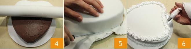 Take the sugar paste, roll it out on a lightly dusted surface with powdered sugar, then wrap it around the rolling pin and unroll it over the cake 4. Trim off the excess sugar paste 5. Decorate the sides and top with meringue swirls 6;
