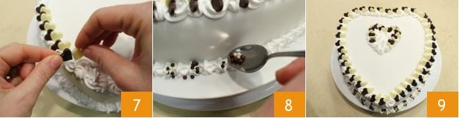 then take the hearts and other chocolate decorations. Place the hearts around the edge of the top, alternating white chocolate ones with dark chocolate ones 7, while decorating all around with the other chocolate decorations 8; if you prefer, you can also make a small heart in the center with meringue and leftover decorations 9.