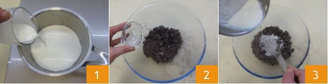 Meanwhile, work on the chocolate ganache and meringue. For the ganache: heat the cream in a saucepan 1, finely chop the dark chocolate and place it in a small bowl. Then take the glucose 2, and put it in the bowl with the chopped chocolate. Pour the hot cream over the dark chocolate in two stages 3,