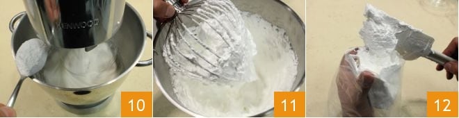 Take the powdered sugar and sift it. Then add it gradually to the meringue 10 and work with the mixers until completely cooled: the result will be a firm and soft, smooth, and glossy mixture 11. Place it inside a piping bag 12 with a star nozzle and store it in the refrigerator.