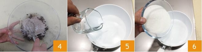 and mix with a whisk to melt the chocolate 4. Once the chocolate is melted and the mixture is homogeneous, you can quickly cool the ganache by placing it in a bowl filled with ice and stirring (this way it will cool without losing consistency and brilliance), or cover it with plastic wrap and let it cool at room temperature. Meanwhile, proceed with the meringue: pour the water into a double-bottomed saucepan 5, add half of the granulated sugar, and cook over low heat 6, stirring with a wooden spoon to dissolve it.