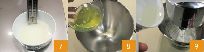 Immerse a candy thermometer 7 to monitor the temperature, which should reach 250°F. When the syrup temperature reaches 237°F, place the egg whites in a stand mixer fitted with a whisk 8 (or use an electric mixer) and beat them at medium speed. When the syrup reaches 250°F, reduce the speed of the stand mixer (to prevent the syrup from splattering on the sides of the bowl), pour half of the syrup into the egg whites 9, and then increase the speed again.