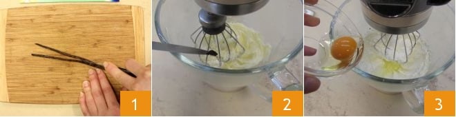 To prepare the heart cake, start with the batter (to make it easier to work with, it is advisable to halve the doses indicated in the recipe and prepare one cake at a time: with the indicated doses, you will get two cakes for two 10x9 inch pans): slit the vanilla pod 1 and scrape out the seeds with the blade of a small knife. Then in the bowl of a stand mixer, add the sugar and softened butter; add the vanilla seeds 2 and start mixing the mixture with the beaters (you can also use an electric mixer); when the mixture becomes fluffy, add the eggs one at a time 3. Continue beating until they are all perfectly incorporated.