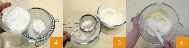 Sift the baking powder 4 and flour 5 then add the dry ingredients to the rest of the mixture a little at a time, stirring with a spatula from top to bottom to combine them with the rest 6.