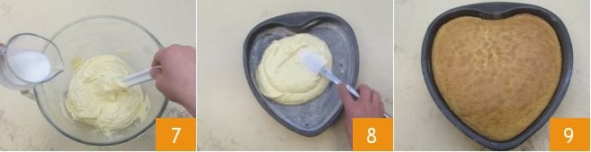 Finally, slowly pour in the milk at room temperature and mix again 7 to obtain a homogeneous mixture. Butter and line with parchment paper 2 heart-shaped pans of 9x10 inches. Divide the batter evenly between them 8. Preheat the oven to 356°F (320°F for convection oven) and bake the bases for approximately 25-30 minutes (15-20 minutes for convection oven), using a toothpick to test if they are done. Once baked, take them out of the oven 9 and let them cool slightly, then remove them from the pans and let them cool completely on a wire rack. Repeat the process for the other cake.