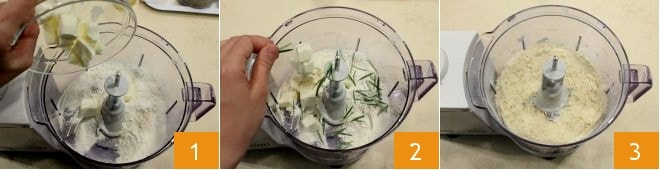 To prepare the heart of rump in crust with lard and porcini mushrooms, start with the Easy Shortcrust Pastry. Put the sifted flour and cold butter pieces from the fridge into a food processor with blades 1. Clean the rosemary and add the leaves 2. Start the blades and blend everything until you get a sandy, floury mixture 3.