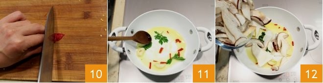 Next, prepare the sauté: cut the chili, remove the stalk and internal seeds, then slice it thinly 10; peel the garlic clove, cut it in half, and remove the core. In a non-stick pan, sauté the oil, garlic, and chili together with some parsley leaves 11. Add the mushrooms 12, salt and pepper to taste, then cook on high heat for 10 minutes.